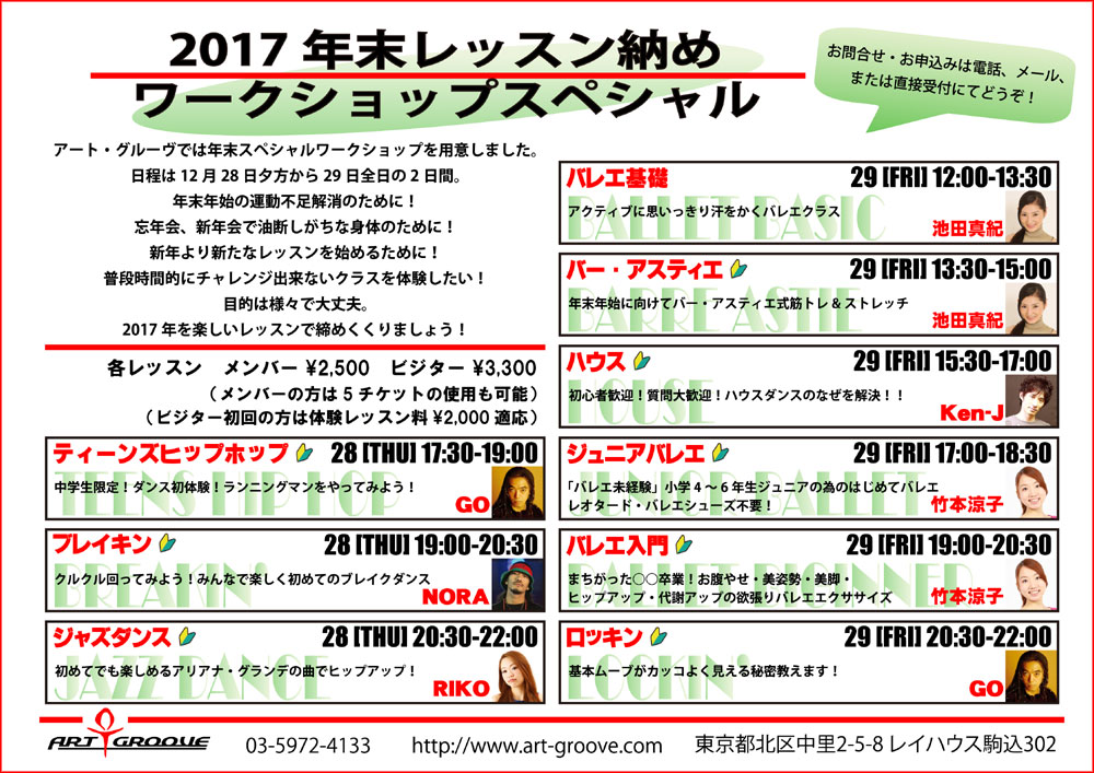 初めてART GROOVEのレッスンに参加をご希望の方には2017年最後のレッスンなので、体験レッスン適応となります。